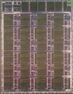 1 pav. CS2112 Silicio kristalo paviršius. Horizontali juosta viršuje atitinka sparčiąją mikroschemos dalį, kurioje yra ARC šerdis. Žemiau rasime perkonfigūruojamąją dalį.
