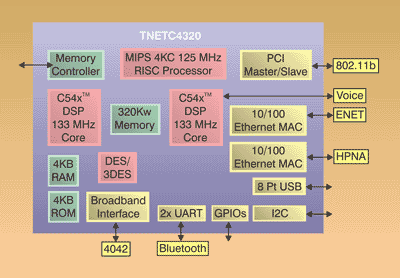 TNETC4320 sudaro RISC procesorius MIPS 4KC, dar vadinamas Jade, ir dvi C54 tipo DSP šerdys. Abi šios dalys turi bendrą 320x16 dydžio atmintinę. Mikroschema tarnauja namų tinklui skirta jungtimi, nes joje yra interfeisai LAN (802.22), Bluetooth, HPNA ir du Etherneto 10/100 portai. Be to, joje yra du balso kanalai. Mikroschema naudoja operacijų sistemą VxWorks.