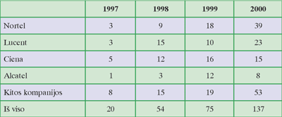 Netgi lyginant 1999 m. pradžią su 2000 metais, kontrastas yra labai ryškus. 1999 m. gegužę atliktoje KMI Corporation studijoje buvo pranešta, kad egzistuoja apie 15 kompanijų, siūlančių DWDM skirtą įrangą. 2000 m. rugsėjo mėnesį šis sąrašas jau buvo išaugęs iki 25 - tas skaičius būtų buvęs dar didesnis, jeigu daug naujų kompanijų nebūtų iškart nupirktos kitų tiekėjų, pavyzdžiui, Qtera pirko Nortel, Chromatis - Lucent, o Qeton - Cisco Systems. Visų tų konkurentų laimei, operatorių, nutarusių įdiegti savo tinkluose DWDM, skaičius augo dar greičiau nei įrangos tiekėjų būrys (žr. lentelę). 1999 m. ataskaitoje KMI nurodė maždaug 75 operatorius iš viso pasaulio, kurie viešai pranešė pasirengę įdiegti DWDM. Lygiai po metų paskelbtų kontraktų skaičius beveik padvigubėjo ir pasiekė 140.