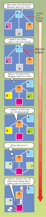 Kaip iš tokios sistemos reikia pasiimti informaciją? Clarke aiškinimu, veikiama panašiai, kaip orientuodavosi žmonės iki išrandant žemėlapius. Pajudėjusi grupė keliautojų pradžioje galėjo žinoti tik tiek, kad jiems reikia traukti į šiaurę. Bet artinantis prie tikslo informacija, gaunama iš pakeliui sutinkamų žmonių, darėsi vis detalesnė, kol galiausiai grupė sutiko žmogų, kuris galėjo pasakyti viską, ko reikia: Taigi ponas, kurio jūs ieškote, gyvena už kampo, antra troba dešinėje pusėje".