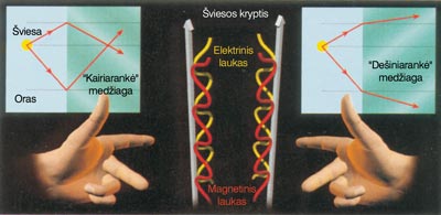 Taigi kas įvyko, kai Veselago savo vaizduotėje sukūrė medžiagą, kurioje šių konstantų ženklas neigiamas? Šios fantastinės medžiagos viduje apsivertė įprastinis sąryšis tarp elektrinio ir magnetinio lauko.