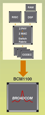 Paulis Shore iš kompanijos Broadcom įsitikinęs, jog turįs būtent tą komponentą, dėl kurio padidės visa IP telefonijos rinka. Labai galimas dalykas, kad jis teisus. Broadcom sukurtajame BCM1100 grandyne didele dalimi integruoti visi IP telefonijos poreikiai. Čia rasime Etherneto su PHY ir MAC galimybių sąsają, kodeką, DSP ir RISC procesorius balso signalų apdorojimui, paverčiant juos duomenų paketais. Tetrūktų tik kelių specialių funkcijų, tokių kaip skystųjų kristalų displėjaus valdymas ar IrDA/USB sąsajos, kuria gamintojai galėtų naudotis personalizuodami savąsias konstrukcijas.