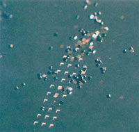 Kas, jei mikroskopiškus lazerius, kuriuos grupė tyrinėjo, būtų galima sukratyti, - dar geriau, sudėti į skystį ir supilti į mažytes silicio plokštelėje esančias skyles? Mano doktorantai pasižiūrėjo į mane taip, lyg man būtų pasimaišęs protas", sako Smithas. Bet po kelių savaičių vienas vaikinas visgi pabandė tai patikrinti, ir paaiškėjo, kad metodas iš tikrųjų veikia." Sėdėdamas prie mikroskopo doktorantas James Yeh pamatė, kaip mažytės galio arsenido dulkelės, kurių skersmuo buvo vos po 30 mikronų, išsklido vandenyje, o po to tvarkingai nugulė į kelis šimtus iš tūkstančių silicio paviršiuje padarytų trapecijos formos kiaurymių.