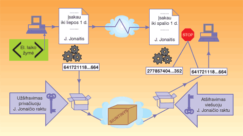 Pasižiūrėkime, kaip veikia vienas iš galimų skaitmeninio parašo mechanizmų". Skaitmeninio parašo veikimą, kurio schema pavaizduota 1 paveiksle [1], galima suskirstyti į keletą grandžių. Pirmojoje grandyje, naudodamas specialią programą (vadinamąją hash" funkciją), siuntėjas iš savo dokumento sugeneruoja duomenų skaitmeninę santrauką. Šiai skaitmeninei santraukai būdinga tai, kad visų, net mažiausių skirtumų turinčių dokumentų santraukos būna skirtingos, ir iš jokios santraukos neįmanoma atkurti pradinio teksto. Santrauka reikalinga tam, kad nereiktų šifruoti viso pradinio dokumento, nes šifravimas asimetriniu būdu, ypač naudojant ilgus šifravimo raktus, užima gana daug laiko. Antroje grandyje siuntėjas tą santrauką kartu su papildomais rekvizitais (laiko žyme ir pan.) šifruoja, naudodamas savo asmeninį raktą. Trečioje grandyje gavėjas, naudodamasis ta pačia specialiąja programa (hash" funkcija), sugeneruoja atsiųstojo dokumento santrauką. Ketvirtoje grandyje gavėjas, naudodamasis siuntėjo viešuoju raktu, iššifruoja siuntėjo atsiųstą šifruotą santrumpą. Penktoje grandyje gavėjas, palyginęs savo sugeneruotą santrauką su iššifruotąja santrauka, įsitikina gautojo dokumento ir nurodytos laiko žymės tikrumu.