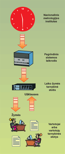 2 pav. Elektroninės laiko žymės formavimo ir perdavimo schema Patikimo laiko sistemoje.