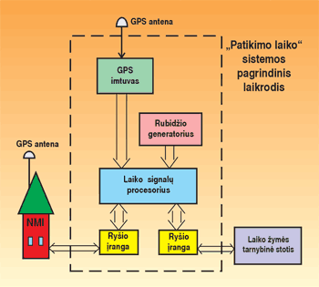 Patikimo laiko" sistemos širdis - tai pagrindinis sistemos laikrodis, kurio sudėtis pavaizduota 3 paveiksle. Pagrindiniame sistemos laikrodyje įrengto rubidžio generatoriaus generuojami sekundiniai impulsai lyginami su GPS (Global Positioning System) imtuvo regeneruotais sekundiniais impulsais. Šitaip yra įvertinamas pagrindinio sistemos laikrodžio nuokrypis nuo UTC (Universal Time Coordinated - koordinuotasis pasaulinis laikas), kurį perduoda GPS sistemos palydovai. Analogiškos laiko lyginimo procedūros atliekamos ir Nacionalinio metrologijos instituto Laiko etalono laboratorijoje. Sulyginus pagrindinio sistemos laikrodžio ir Nacionalinio metrologijos instituto rezultatus, įvertinamas pagrindinio sistemos laikrodžio sekundinių impulsų nuokrypis nuo Nacionalinio metrologijos instituto laiko etalono sekundinių impulsų. Kadangi Nacionalinio metrologijos instituto laiko etalonas griežtai susietas su koordinuotuoju pasauliniu laiku (UTC), yra užtikrinama Patikimo laiko" sistemos pagrindinio laikrodžio sietis su UTC laiku. Kyla klausimas, kodėl negalima tiesiogiai per GPS sistemą susieti pagrindinio sistemos laikrodžio su UTC? Tokiu būdu organizuojant laikrodžių sietį, laiko skalių sieties neapibrėžtis dėl jonosferos ir troposferos poveikio GPS signalų sklidimui bei GPS imtuvų charakteristikų nestabilumo sudaro nuo 10 iki 50 milisekundžių. Ši neapibrėžtis neatitinka elektroninei laiko žymei keliamų reikalavimų.