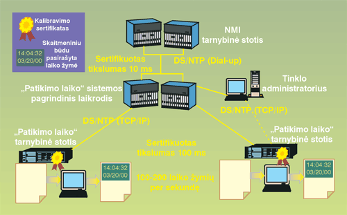 Kaip pagrindinis sistemos laikrodis bendrauja" su Nacionaliniu metrologijos institutu? Jau buvo minėta, kad Nacionalinis metrologijos institutas periodiškai tikrina sistemos pagrindinį laikrodį, įvertindamas jo laiko skalės nuokrypį nuo UTC. Jeigu šis nuokrypis neviršija 10 milisekundžių, institutas siunčia pagrindiniam laikrodžiui jo nuokrypio vertę ir naują sertifikatą. Visas pasikeitimas duomenimis vyksta naudojant kodavimo viešuoju raktu technologiją. Tokiu būdu Nacionalinis metrologijos institutas gali kontroliuoti kelis šimtus pagrindinių Patikimo laiko" sistemos laikrodžių.