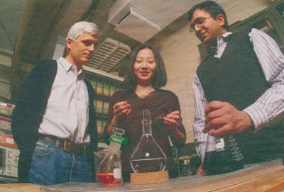 Mokslininkai Christianas Klocas, Zhenan Bao ir Ananthas Dodabalapuras demonstruoja politiofeno, kurį jiems pavyko paversti superlaidžiu, tirpalą.