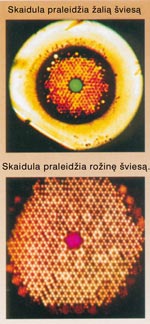 1 pav. Tuščiavidurės šerdies skaidulos praleidžia tik tam tikrus šviesos bangos ilgius. Šios skaidulos apšviestos balta šviesa.