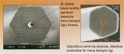 2 pav. Fotoninės draustinės juostos medžiagos skerspjūvyje matyti išilgai skaidulos nusitęsiančios skylės. Jos turi tokį pat poveikį šviesai kaip ir plokštės (stikle susikertančių sluoksnių rinkiniai).