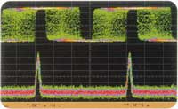 2 pav. Valdantysis moduliatoriaus signalas (viršuje) turi tam tikrą tirtį, kuris yra specialiai įjungtas siekiant pakartoti elektrinių sistemų ypatumus, tačiau trumpų impulsų lazeris, priimantis ir optiškai persiunčiantis signalą, pašalina šiuos iškraipymus (apačioje).
