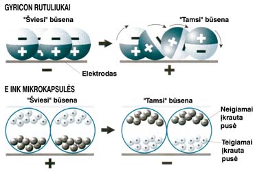Abi dabar egzistuojančios komercinės elektroniškai konfigūruojamo popieriaus technologijos remiasi mikroskopiškais karoliukais, keičiančiais savo spalvą priklausomai nuo netoliese esančių elektrodų įtampos. Gyricon Media sukurtas "SmartPaper naudoja dvispalvius kietus rutuliukus, besisukančius vietoje (viršuje). E-Ink elektroninis rašalas naudoja permatomas, skystyje pakabintas mikrokapsules, kurių viduje yra pigmento (apačioje).