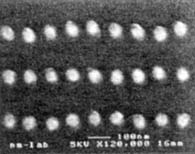 3 pav. Nanometriniai taškai, iš kurių bus sudaryti kitos kartos terobaitiniai kietieji diskai. Paveikslėlyje parodytos įmagnetinamos 35 nm skersmens "ausys". Darinys yra gaminamas naudojant nanometrinio įspaudo technologiją; šviesa tokių mažų matmenų neleidžia gauti.