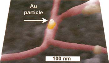 4 pav. Vienelektronis tranzistorius (SET), kuriame 7 nm aukso dalelė yra adresuojama per du anglies nanovamzdelius, veikiančius lyg nanometrų dydžio kontakto laidininkai.