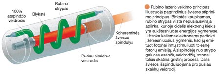 Be abejo, svarbiausia sukurti aktyviąją lazerio terpę. Vienas pirmųjų lazerių buvo sukonstruotas rubino, kuris yra chromu legiruotas kristalinis aliuminio oksidas, pagrindu. Rubinas turi savybę sugerti elektromagnetinę energiją ir šios sužadintos būsenos išbūti apie 4 ms. Tokie rubino lazeriai kaupinami galinga aplink rubino strypą "apsivyniojusia" blykste (1 pav.).