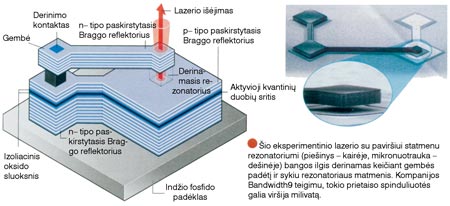 Kalifornijoje iškilusi Bandwidth9 kompanija neseniai paskelbė parengusi gaminti VCSEL, kuris derinamas mikromechaniniais įtaisais. Jo išėjimo galia be optinio kaupinimo siekė vos 100-200 mW. Tačiau Bandwidth9 kompanija tvirtina, kad į lustą integravusi mechaniškai valdomą gembę, ji savo laboratorijoje gavo daugiau kaip 1 mW (5 pav.). Ši gembė skirta lazerio rezonatoriaus ilgiui ir drauge spinduliuotės bangos ilgiui keisti. Kompanijos teigimu, šis lazeris bus panaudotas metropoliteno, kuriame atstumai retai kada viršija 200 km, optinio tinklo reikmėms.