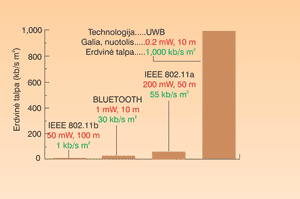 1 pav. Trumpo nuotolio bevielio ryšio sistemų erdvinės talpos palyginimas. Erdvine talpa, matuojama kilobitais per sekundę į kvadratinį metrą (kb/s m2), įvertinama geriau tinkama technologija perduoti didelius duomenų kiekius ribotoje erdvėje, kurioje yra susitelkę daug vartotojų.