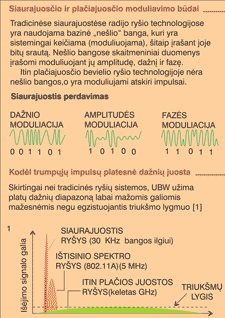 Itin plačiajuostis bevielis ryšys skiriasi nuo įprastinių radijo ryšio formų, pavyzdžiui, AM/FM, trumpųjų bangų, televizijos ir taip toliau. Visose šiose siaurajuostčių paslaugų formose vengiama bet kokios tarpusavio sąveikos, todėl stengiamasi naudoti tik siaurą paslaugai paskirtą dažnių juostą, dar vadinamą nešliu (carrier wave). Duomenų žinutės yra įspaudžiamos nešlio signale kokiu nors būdu moduliuojant jo amplitudę, dažnį arba fazę, o po to, priėmus signalą, jos atkuriamos (žr. 2 pav., kur pasakojama apie moduliavimo būdus).