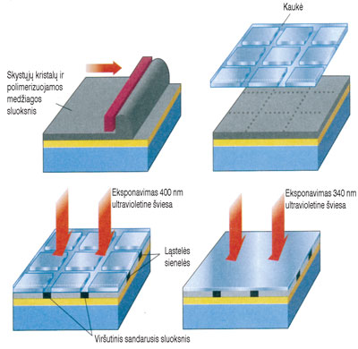 Philips laboratorijos sukurtas šviesos skatinamas polimerizacijos procesas LCD formuoja keturiais etapais (nuo viršaus iš kairės): skystųjų kristalų ir polimerinių medžiagų mišiniu "užtepamas" padėklas; gautas sluoksnis užklojamas reikiamo piešinio kauke; sluoksnis pro kaukę eksponuojamas 400 nm ultravioletine šviesa, kad polimerizuotųsi paviršiui statmenų sienelių tinklas; be kaukės 340 nm ultravioletine šviesa formuojamas viršutinis sandarusis sluoksnis.
