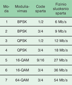 1 lentelė. HyperLAN2 fizinio sluoksnio modos.