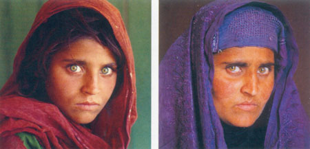 1 pav. 1984 m. nufotografuota nežinoma afganų pabėgėlė 12 m. amžiaus našlaitė. 2002 m. trisdešimtmetė afganų moteris Shanbat Gula pagal akių rainelės kodą identifikuota kaip ši dingusi be žinios 12-metė