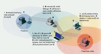 pradėti su juo keistis duomenimis. Pastarasis perduos visas žinutes likusiai